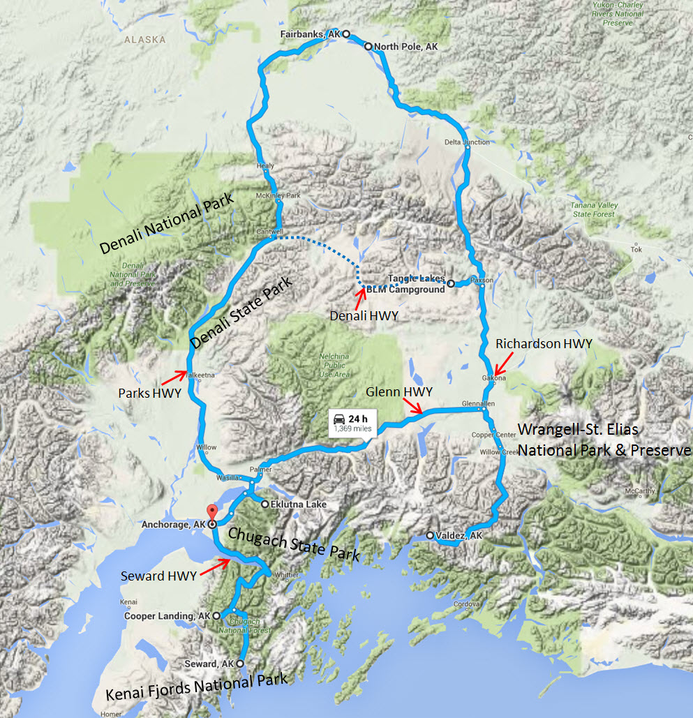 这次行程规划一共11天(去掉第一天坐飞机的时间),到达阿拉斯加的Anchorage之后,我们和朋友一家会各租一辆房车开往南到Seward,北到Denali国家公园和Fairbanks, 最后计划到南部的Valdez。请看下面的路线图。计划行驶1400迈左右,最后还车时发现实际驾驶里程为1550迈。